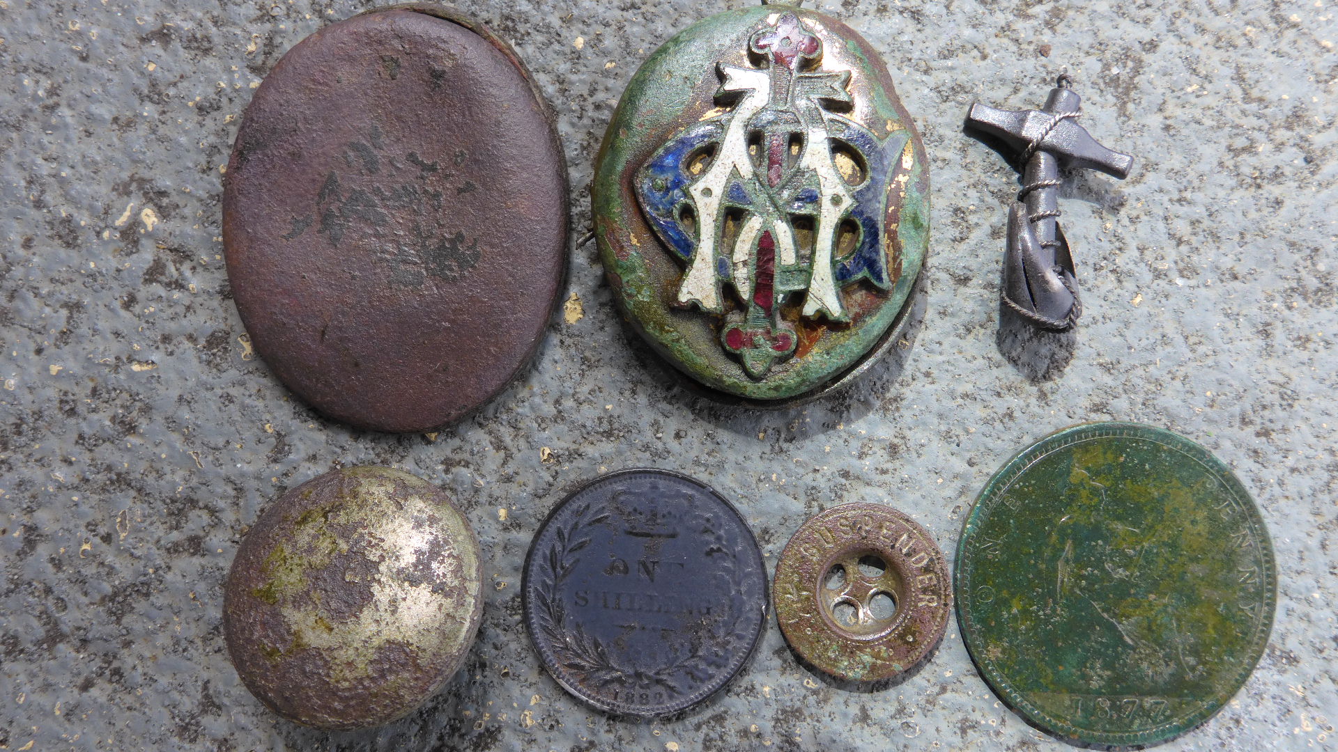 G’day Karl . Couple of smashed 3ring bullets there . They are .577 Snider’s . Also some 577/.450 MH’s that have been flattened for some purpose with one having W cut into both sides ? The monogrammed item is a complete locket , half of another one beside it . I really like the silver anchor pendant , pity it’s so bent .